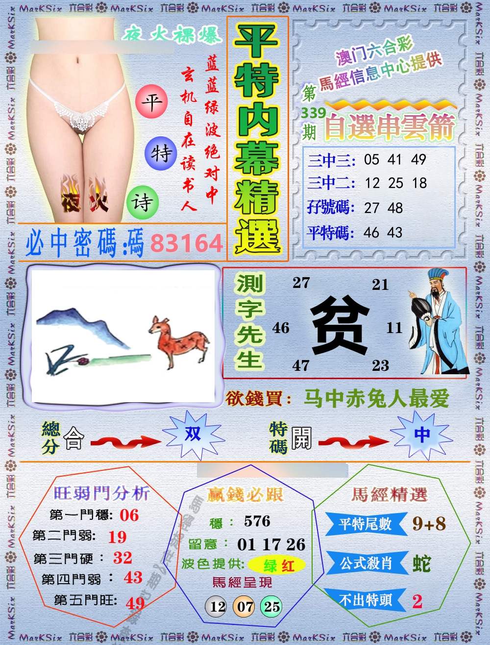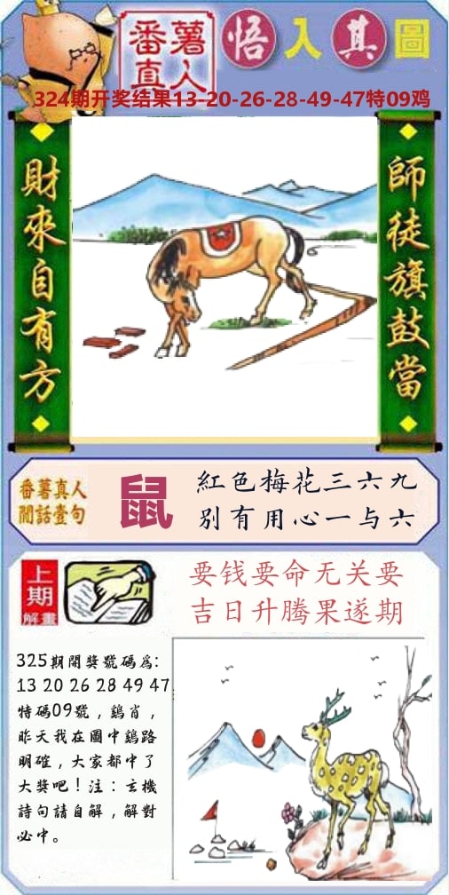 解:明肖马。佳人解羊蛇鸡兔。绿解绿肖牛龙羊狗。天偏看解出的天肖马兔牛龙。玄机诗表达的是帝王微服私访觅得佳人,虽然觅得佳人但还是心系天下。综合得马牛龙兔羊蛇,开兔15